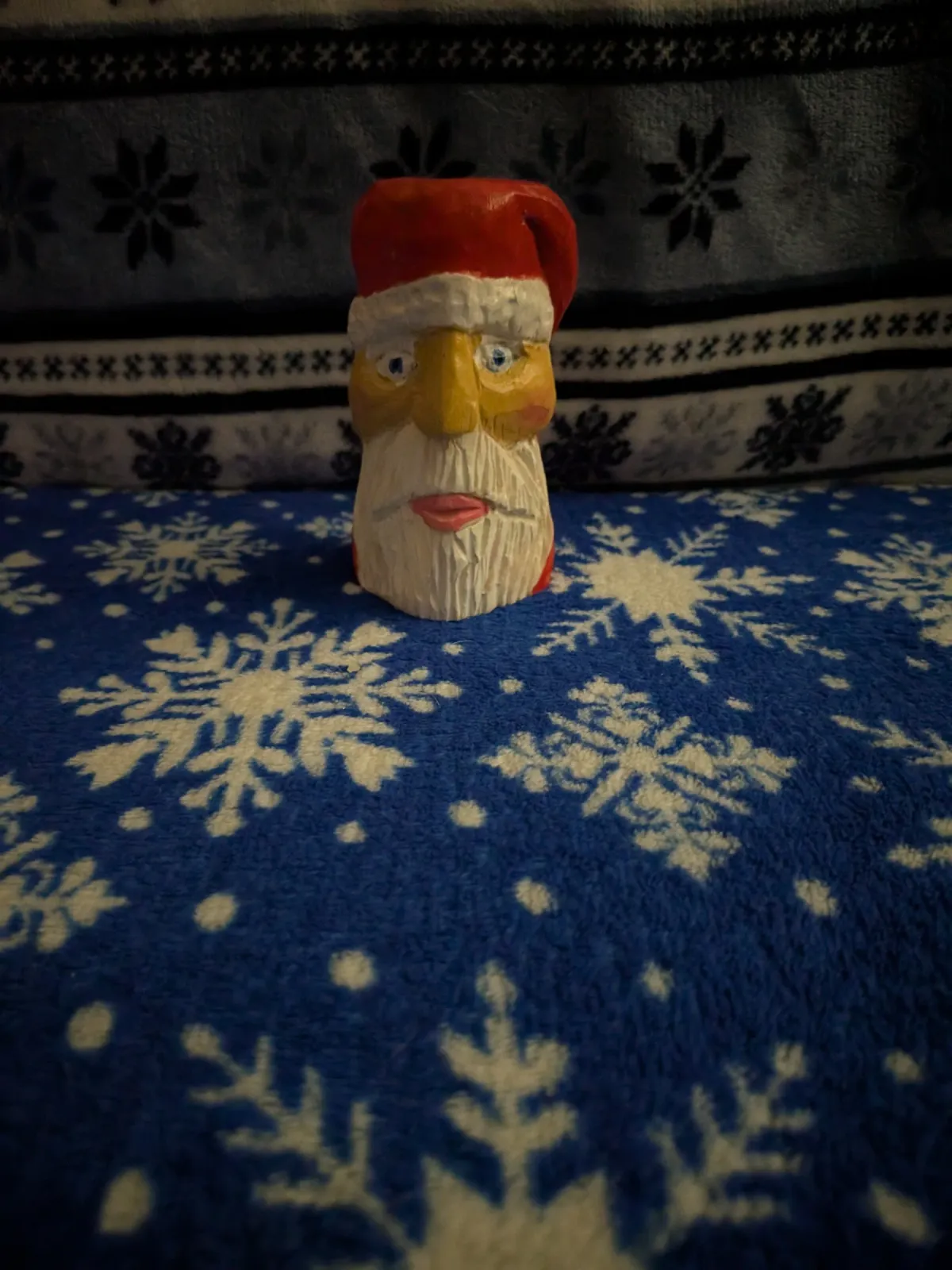 Santa Clauswooden carvingChristmasholiday decorationsnowflake patternblue blanketwinter themeRealismStorytelling / NarrativeSpiritual / SymbolicHistorical / Cultural