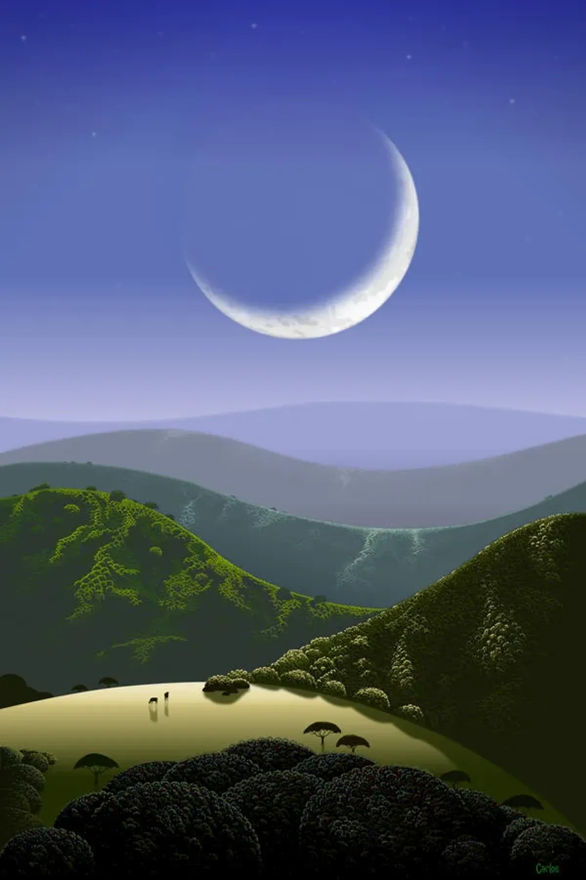 crescent moonnight landscapegreen hillsserenedreamlikecelestialtranquilRealismLight / SereneContemporary / ModernLandscape / NatureSpiritual / Symbolic