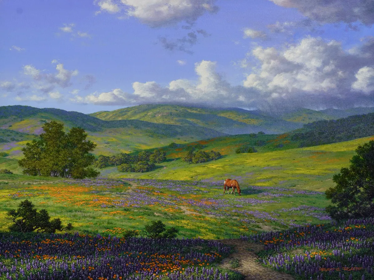 landscapewildflowershorsehillsnaturespringvibrantRealismLight / SereneStorytelling / NarrativeLandscape / NatureAnimals / WildlifeSpiritual / Symbolic