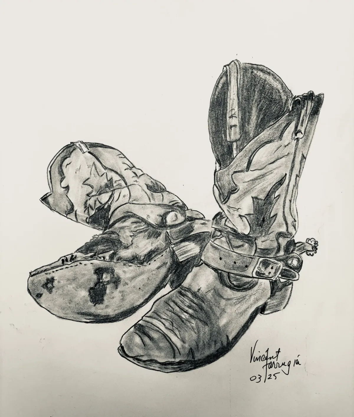 cowboy bootspencil sketchstill lifewesterndrawingspursmonochromeRealismDark / DramaticStorytelling / NarrativeStill Life / ObjectsHistorical / Cultural