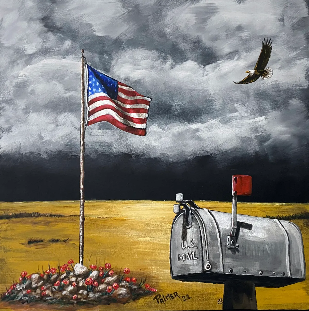 American flagU.S. MailboxBald eagleStormy skyRural landscapePatriotic artGolden fieldRealismDark / DramaticStorytelling / NarrativePatriotic / Military / FreedomLandscape / NatureAnimals / WildlifeSpiritual / Symbolic