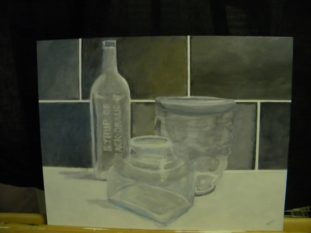 still lifeglass bottlesmonochromaticvintagepaintingantique objectstabletopRealismDark / DramaticStorytelling / NarrativeStill Life / ObjectsHistorical / Cultural