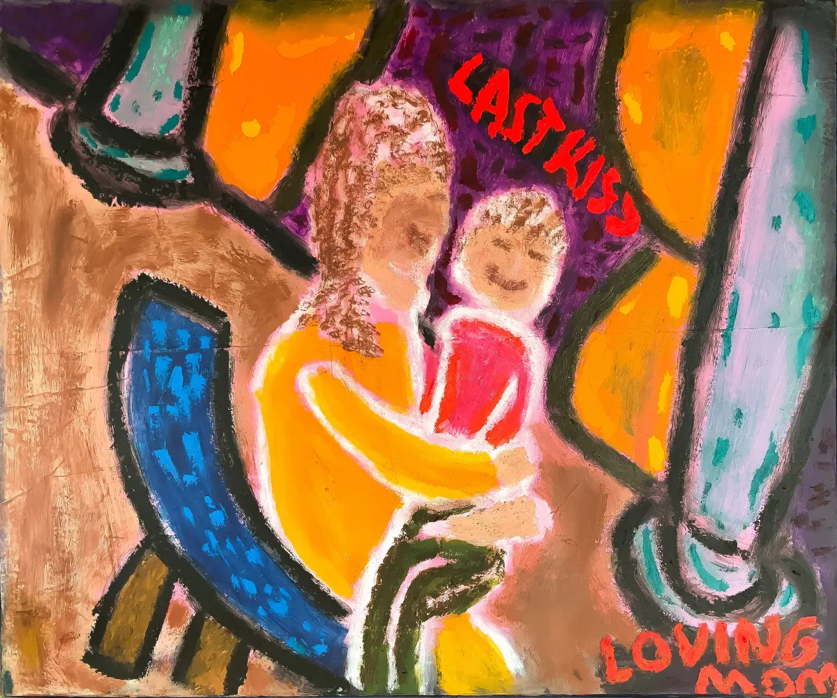 mother and childabstract figuresemotionaltext artbold colorsexpressivefamily bondExpressionism / EmotionalBold / GraphicStorytelling / NarrativePortrait / PeopleSpiritual / SymbolicHope / Healing / ResilienceConflict / Sacrifice