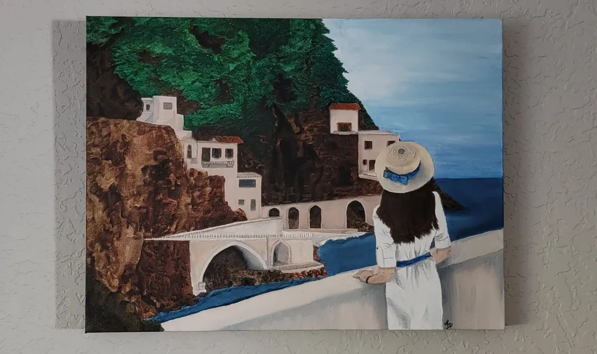 coastal villageseascapecliffside townwoman with hatMediterranean landscapebridgewaterfrontRealismStorytelling / NarrativeLight / SereneLandscape / NatureSeascape / WaterCity / ArchitecturePortrait / PeopleHistorical / Cultural