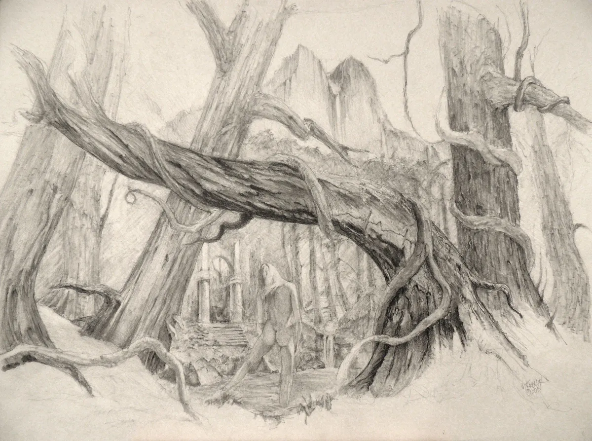 pencil drawingforestfantasyfiguremonochromaticancient treesruinsRealismDark / DramaticStorytelling / NarrativeLandscape / NaturePortrait / PeopleHistorical / CulturalSurreal / ImaginativeSpiritual / Symbolic