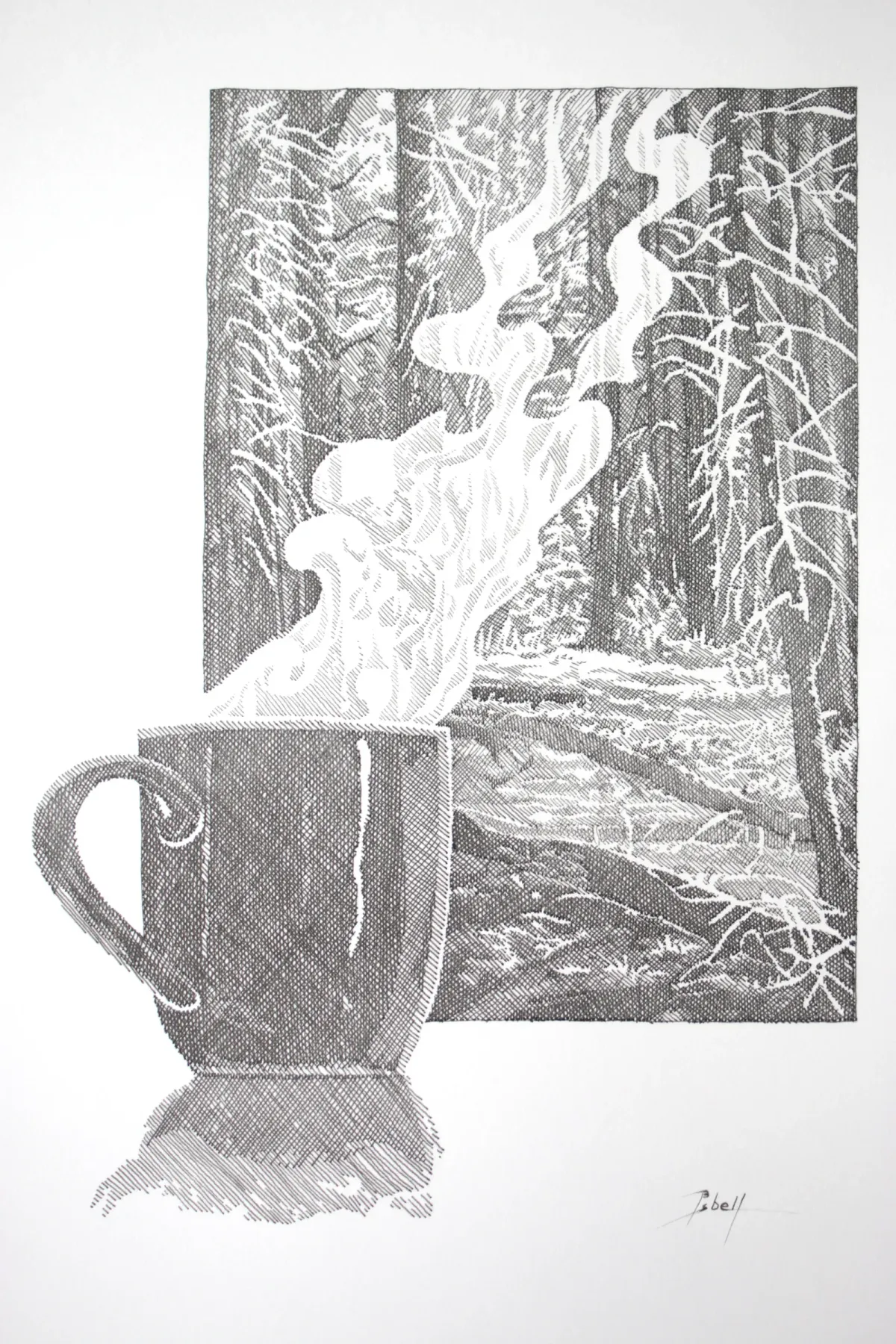 pen and inkforestmugsteamnaturedrawingmonochromeRealismContemporary / ModernLight / SereneStorytelling / NarrativeTherapeutic / ReflectiveLandscape / NatureStill Life / ObjectsHope / Healing / Resilience
