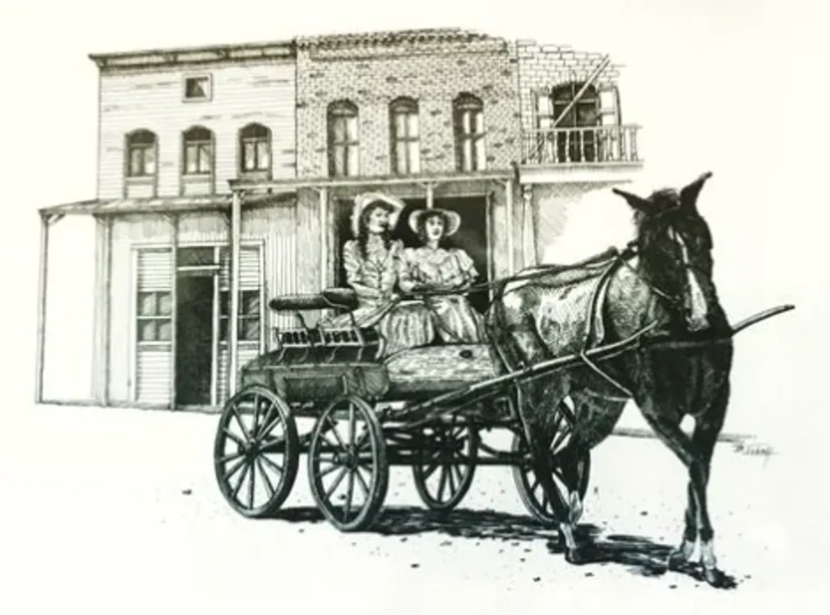 Ink drawingHorse-drawn carriageHistoricalWomenVictorian eraBuildingBlack and whiteRealismStorytelling / NarrativeBold / GraphicPortrait / PeopleHistorical / CulturalCity / Architecture