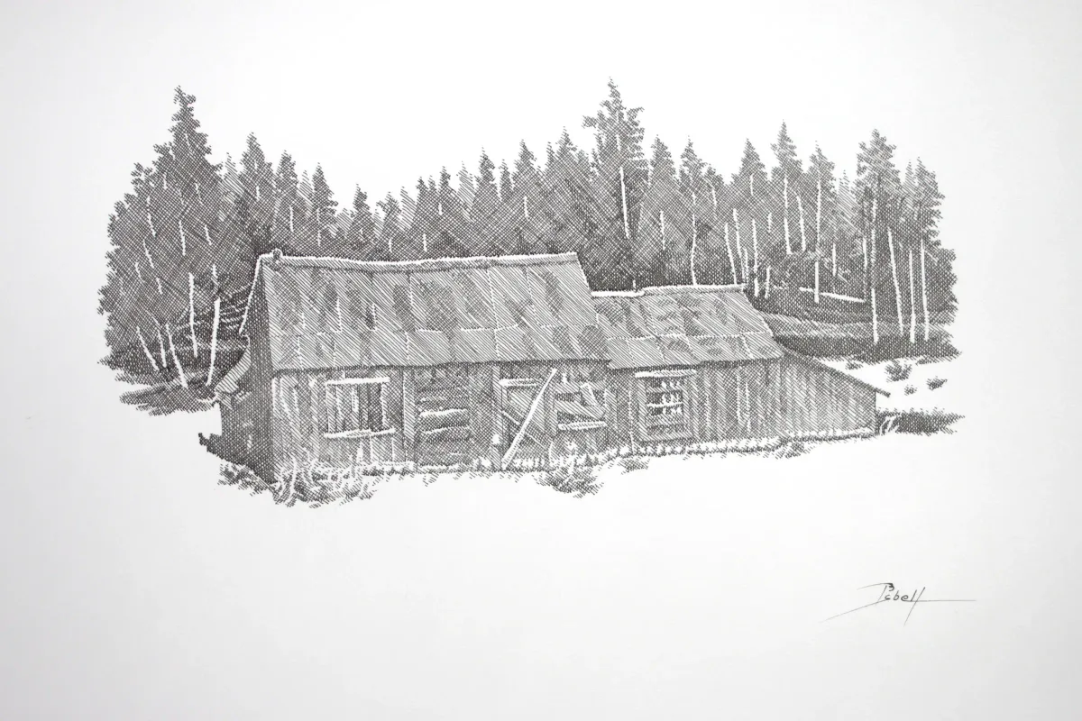 pen and inkdrawingcabinforestrustichatchingmonochromaticRealismStorytelling / NarrativeDark / DramaticLandscape / NatureHistorical / Cultural