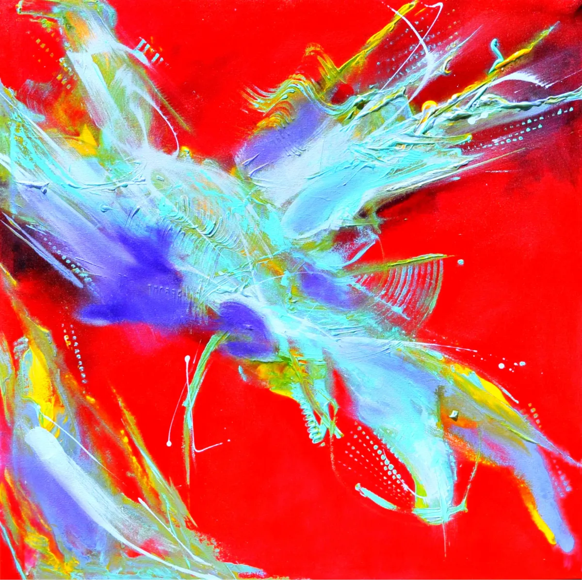 Abstract artExpressive paintingDynamicVibrant colorsBold brushstrokesRed backgroundEnergyAbstractExpressionism / EmotionalContemporary / ModernBold / GraphicInspirational / UpliftingAbstract / Conceptual