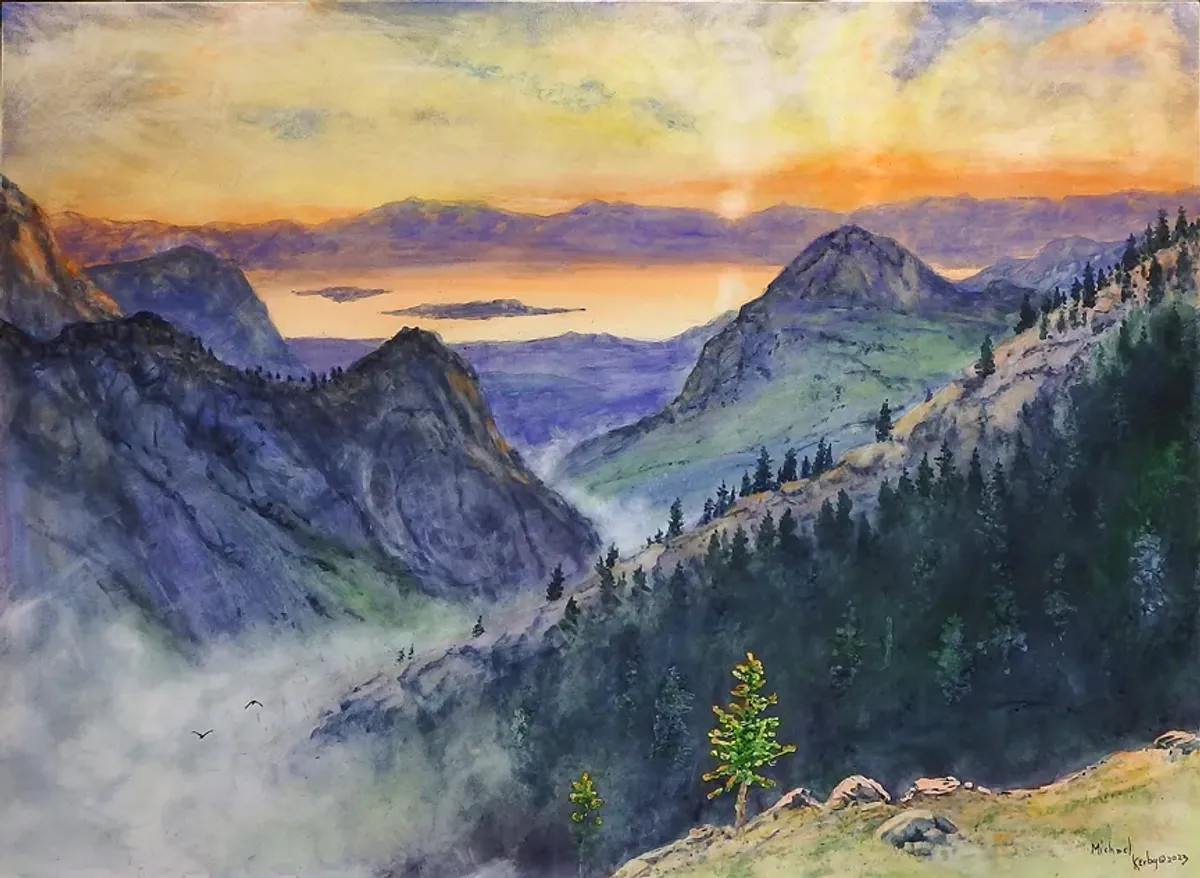 MountainLandscapeSunsetSunriseMistForestNatureValleyWatercolorRealismLight / SereneLandscape / Nature